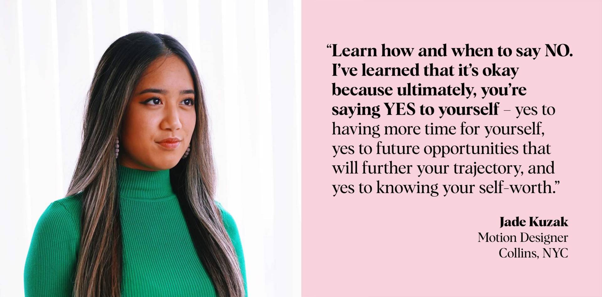 “Learn how and when to say NO. I’ve learned that it’s okay because ultimately, you’re saying YES to yourself… I keep this in my back pocket because it’s a nice reminder that opportunities come and go but putting yourself first should be a priority.”