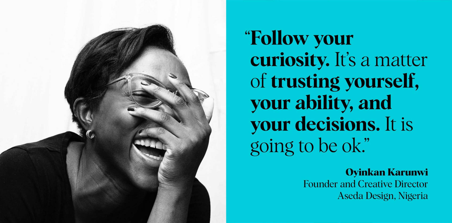 If anyone can talk about the experience of being thrown in the deep end, it is the founder and creative director of Nigeria-based studio Aseda Design, Oyinkan Karunwi. With an unconventional route into the design world, Oyinkan got her first taste of graphic design whilst at university studying law, creating flyers and posters for friends’ parties. It wasn’t until Shillington Education was recommended by a friend that she felt able to switch careers and pursue her love of creativity full-time. After completing the NYC course in 2019, Oyinkan returned to Nigeria to set up her own studio and it’s safe to say she’s never looked back.