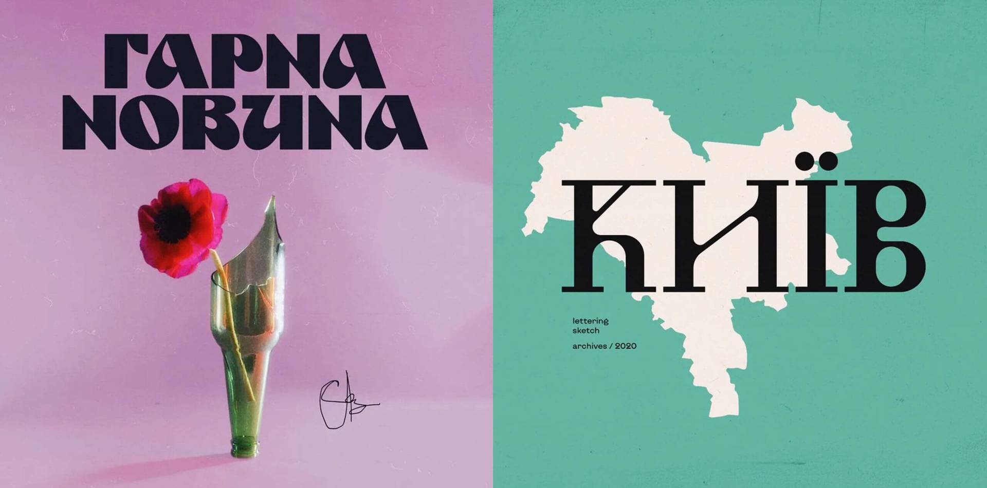 Left: Artwork cover of a anti-war song ‘Good News’ written by Andriy Savdeyev. Right: Lettering sketch of Kyiv from 2020. Created by Katerina Korolevtseva.