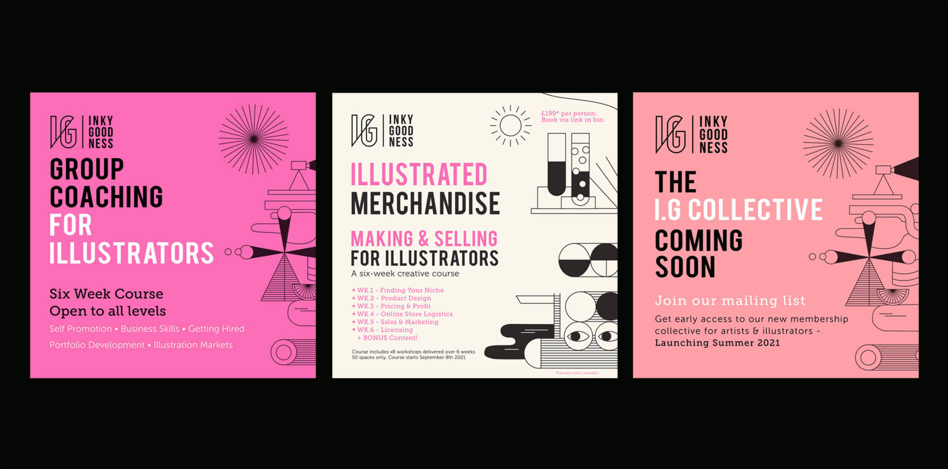 We’re also launching our new online membership community – Inkygoodness Collective – this Summer, inviting artists and illustrators across the globe to come together for online events, exhibitions, courses, mentoring and much more. Over the last six months I have run several coaching programmes and courses, launched our IGTV channel; interviewing people from the creative industry every week, so the membership is a way to add even more value to our community. We’ve got a new website underway and big plans for 2022/2023. There is huge potential to grow the collective into something really special and I can’t wait to open our doors!