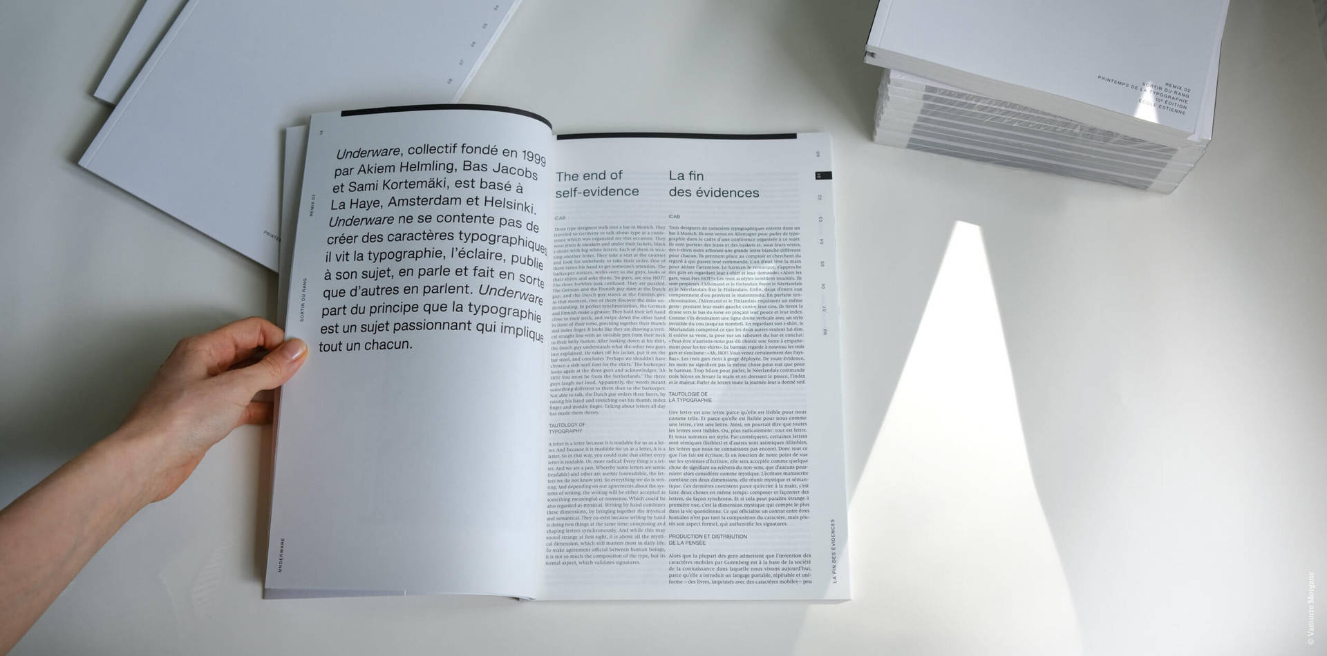 I love designing books. Editorial design projects require specific conditions for the choice of typefaces, taking into account the criteria of readability. Usually this is the first criterion that comes to my mind when selecting a typeface: eye height not too low in order to facilitate reading at low scale. At the moment, I like Karmina by TypeTogether or Savon by Fanny Hamelin. I also like Slussen by Hugo Jourdan (Blazetype) if I’m looking for a sans serif. By the way, I also like to contrast this aspect of readability by choosing an expressive typography for the titles and the cover or an expressive layout to surprise the reader and amuse their eyes.