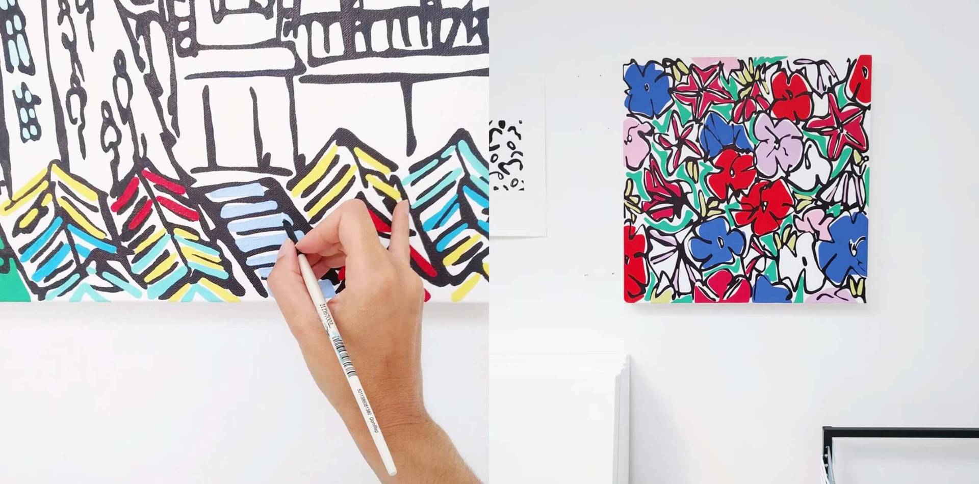 The process depends on the subject. For cityscapes and floral pieces, I will start pencil sketching on paper; this is always the best way to plan a composition and flow with fast paced marks. It’s like warming up really. Then I use pens and inks to draw the image again until I’m used to the shapes and flow of the piece. Once I’m happy I’ll move onto photoshop to create the colour palettes and plan out what the picture will look like. Then I shift to canvas and acrylic paint. I use acrylic because I like to achieve an almost print like, flat and bold effect. My abstracts are more organic and involve just playing with the movement of paints and inks. There’s no drawing stage here – I just rely on the compositional ideas being led by the materials.