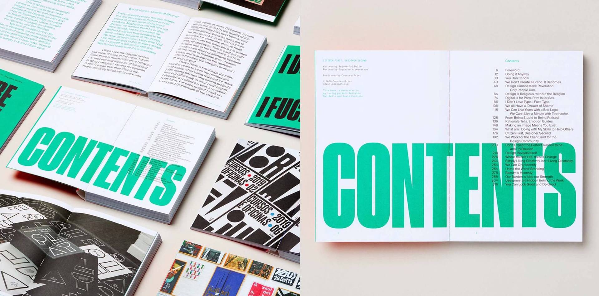Throughout most of her career Rejane has also lectured alongside her work as a designer. She found that the time-limit of lectures prevented her from delving into subjects in depth. The experience of writing her book, Citizen First Designer Second, has enabled her to do just that. Whilst she wrote the first draft of the book in just seven days, it is based on fifteen years of accumulated knowledge, learning and experience. The book reflects on the parallels between being a designer and being a citizen. Rejane draws on her own experiences as a designer to discuss a range of topics, including beauty, branding, the meaning of an image, what is our value as a designer, and what is our role in society.