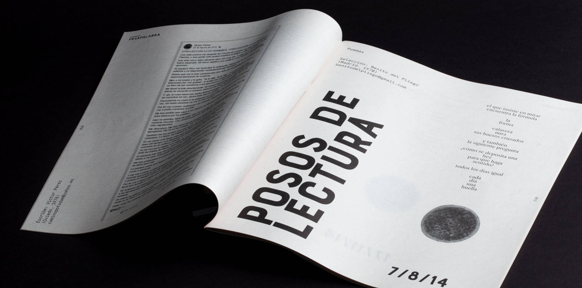 I feel like a visual therapist. I advise different people to visually translate messages that they want to share with the world. Whether they are books, fanzines, magazines, posters, etc. I enjoy finding points and symbols in the process of conceptualizing. The execution is fun because I always try to collaborate with different people, I like to mix my work with printers that have experimental ways of transforming products through materiality and also with photographers or illustrators. But perhaps what I enjoy the most is the thinking process.